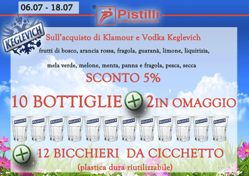 Sull’acquisto di Klamour e Vodka Keglevich frutti di bosco, arancia rossa, fragola, guaranà, limone, liquirizia, mela verde, melone, menta, panna e fragola, pesca, secca SCONTO 5% e 10 BOTTIGLIE + 2 IN OMAGGIO + 12 BICCHIERI DA CICCHETTO (plastica dura riutilizzabile)!