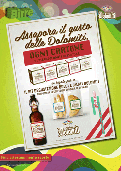 Ogni CARTONE di BIRRA DOLOMITI ROSSA cl75 in regalo per te il kit degustazione DOLCI e SALATI DOLOMITI, composto da 12 confezioni di dolci e 18 di salati!