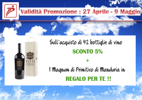 Sull’acquisto di 42 bottiglie di vino SCONTO 5% + 1 Magnum di Primitivo di Manduria in REGALO PER TE !!
