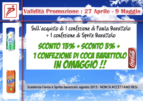 Sull’acquisto di 1 confezione di Fanta Barattolo + 1 confezione di Sprite Barattolo SCONTO 13% + SCONTO 3% + 1 confezione di COCA barattolo IN OMAGGIO !!