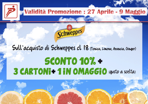 Sull’acquisto di Schweppes cl 18 (Tonica, Limone, Arancia, Ginger) SCONTO 10% + 3 CARTONI+ 1 IN OMAGGIO (gusto a scelta)!