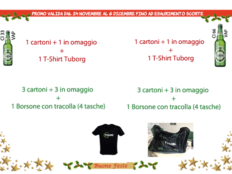 BIRRA TUBORG cl 33 e cl 66: 1 cartoni + 1 in omaggio + 1 T-Shirt Tuborg ; 3 cartoni + 3 in omaggio + 1 Borsone con tracolla (4 tasche)!