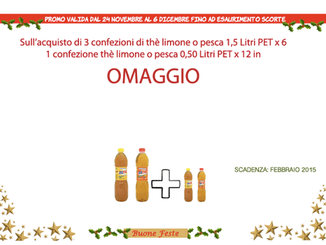 OFFERTA ESTATHE’: sull’acquisto di 3 confezioni di thè limone o pesca 1,5 Litri PET x 6 in OMAGGIO 1 confezione thè limone o pesca 0,50 Litri PET x 12