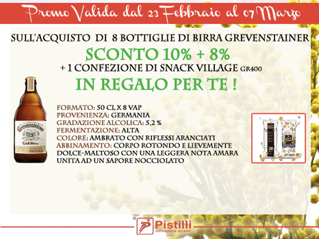 Sull’acquisto di 8 BOTTIGLIE DI BIRRA GREVENSTAINER sconto 10% + 8% + 1 CONFEZIONE DI SNACK VILLAGE gr400 IN REGALO PER TE!